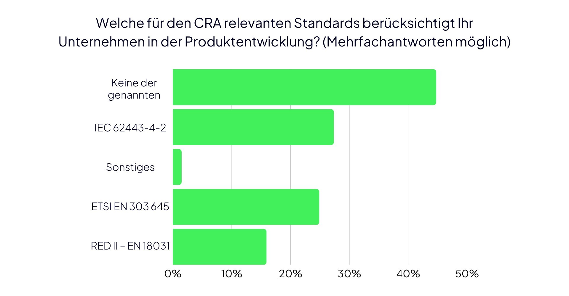 So berücksichtigen lediglich 27 Prozent der befragten Firmen die Norm IEC 62443-4-2, die technische Sicherheitsanforderungen für Komponenten industrieller Automatisierungs- und Steuerungssysteme (IACS) definiert. Der etablierte Standard IEC 62443-4-2 bietet etablierte Verfahren zur Erfüllung von technischen Cybersicherheitsanforderungen und hilft so wesentlich eine zukünftige CRA-Compliance zu erreichen.